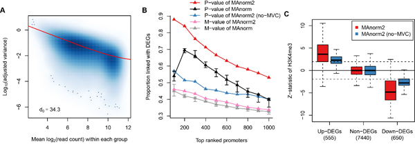 图一:(A)在不同基因组区域间拟合均值-方差曲线(mean-variance curve;MVC)。(B)根据不同的统计指标对基因启动子按照差异H3K4me3 ChIP-seq信号的可能性进行排序,并计算其中差异表达基因(differentially expressed genes;DEGs)启动子所占的比例。(C)检查不同类型的基因启动子上差异H3K4me3的统计显著性。虚线对应P值为0.05。