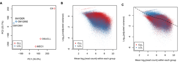图二:(A)对来自不同的人的H3K27ac ChIP-seq样本进行主成分分析。这里LCL(lymphoblastoid cell line)组包含三个源于正常人的B细胞的细胞系;CLL(chronic lymphocytic leukemia)组包含三个源于慢性淋巴细胞白血病患者的B细胞的细胞系。(B)关于来自不同组的均值和未修正的方差的散点图。(C)关于均值和修正后的方差的散点图,以及由此进行下一步统计建模。