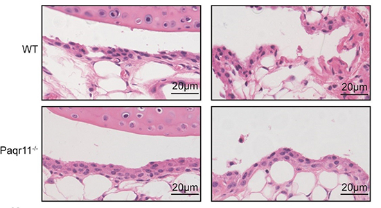 陈雁研究组博士生林毅君等人首先在公开数据库中发现PAQR11在单核细胞往巨噬细胞分化中有大量的表达变化,随后对不同来源的单核细胞诱导分化,都发现了PAQR11的表达提升。缺失了PAQR11的单核细胞则表现为分化减弱、凋亡增强。进一步研究发现,PAQR11通过调节MAPK信号通路影响该分化过程,并且C/EBPβ是PAQR11的直接上游,调节PAQR11的表达。最后,研究者们在PAQR11敲除小鼠中构建类风湿性关节炎模型,证明敲除导致的单核细胞分化减弱能够改善小鼠关节炎症状。该工作首次揭示了PAQR11能够在机体中发挥免疫调节功能,并且阐述了单核细胞成熟在类风湿性关节炎发病中发挥了重要作用。研究鉴定了PAQR11的直接上下游分子,为单核细胞分化阐明了一种新的调控机制,并对类风湿性关节炎的治疗提供了新的思路。