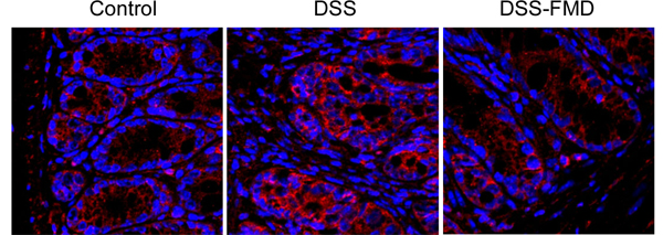 图注:图为结肠切片的炎症小体NLRP3的免疫荧光染色,红色为NLRP3阳性细胞,蓝色为细胞核。DSS诱导的肠炎中炎症小体明显增加,而间歇性模拟禁食干预(FMD)可以显著减少炎症小体。