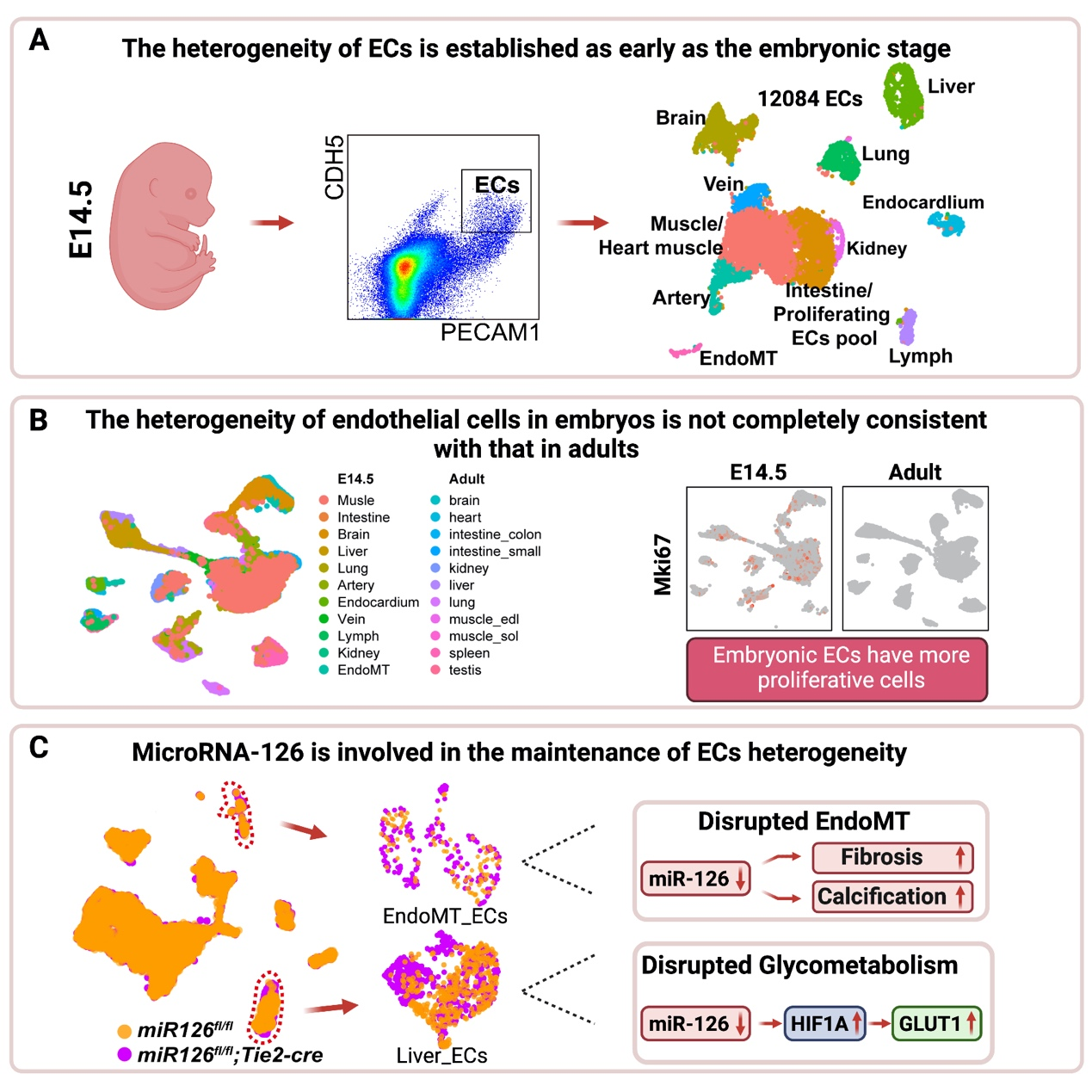 图:血管内皮细胞在胚胎期14.5天已表现出异质性且MircoRNA-126积极参与内皮细胞异质性的稳态维持
