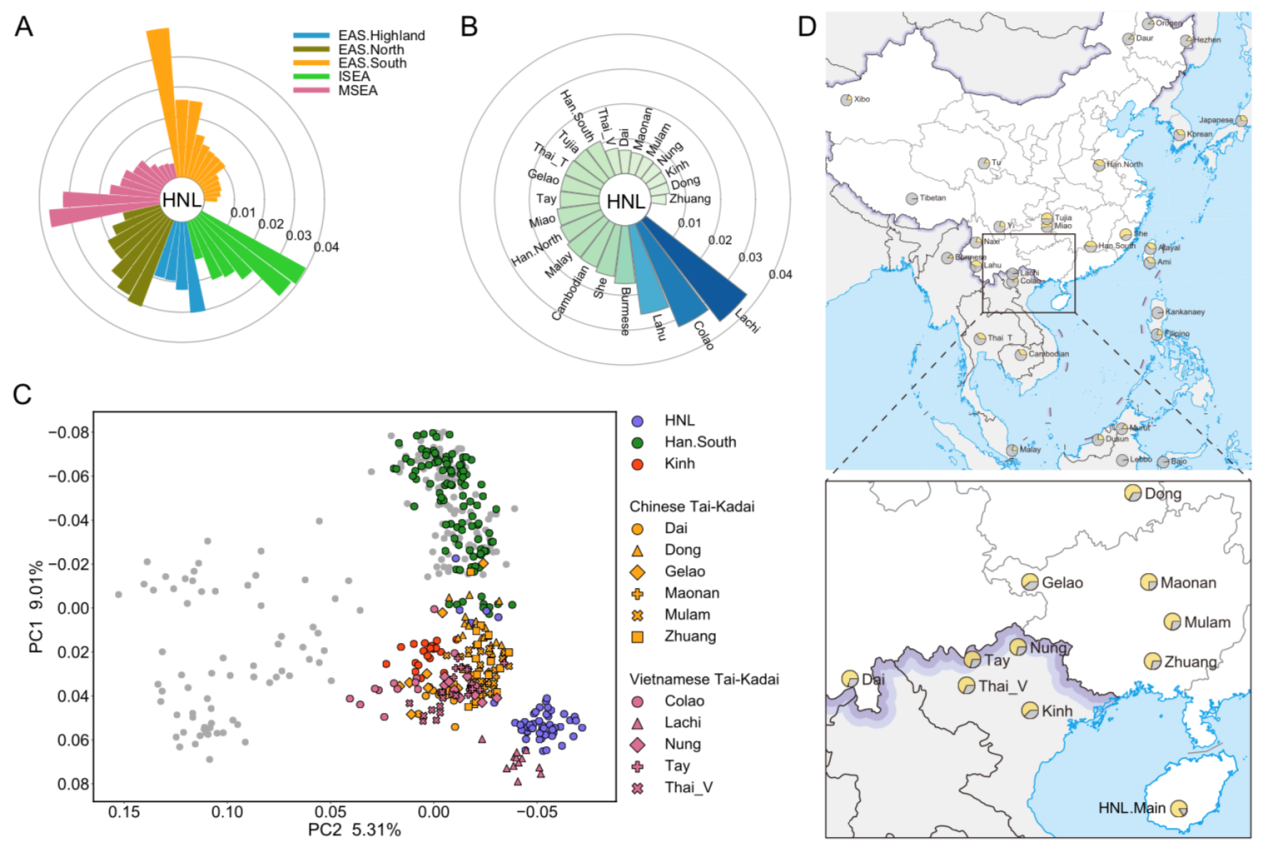 2022年9月30日,分子进化领域知名国际期刊《Molecular Biology and Evolution》在线发表了中国科学院上海营养与健康研究所的研究成果“Tracing Bai-Yue ancestry in aboriginal Li people on Hainan Island”。研究团队基于全基因组测序数据分析研究了海南黎族(HNL)的遗传起源、群体历史和适应性进化;并结合我国和越南的侗傣语系族群,重构了“百越”族群的遗传演化模型;为深入了解我国上古人群与当今中华民族的历史渊源提供了基因证据和遗传学视角。