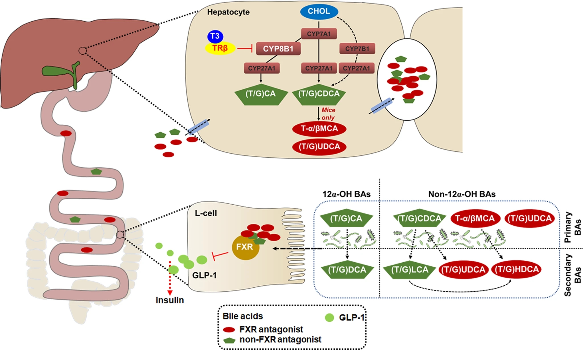 2022年10月27日,中国科学院上海营养与健康研究所应浩研究组在Nature Communications期刊在线发表了标题为“Hepatic thyroid hormone signalling modulates glucose homeostasis through the regulation of GLP-1 production via bile acid-mediated FXR antagonism”的研究论文。该研究发现了甲状腺激素能够通过GLP-1与血糖稳态建立联系。激活肝脏甲状腺激素信号通路具有促胰岛素分泌和降低血糖的作用,作用方式为通过抑制CYP8B1的表达而改变胆汁酸的组成,增加了具有FXR拮抗作用的non-12α-羟基胆汁酸的水平,从而通过抑制肠道FXR信号通路来增加GLP-1的产生,揭示了以肝脏为靶点的TRβ激动剂在未来具有治疗2型糖尿病的可行性。