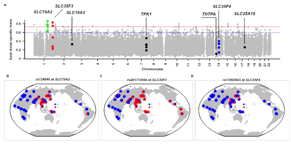 总体而言,该研究发现维生素B1代谢通路相关基因(SLC19A2, SLC35F3, SLC35F4)在东亚人群受到特异性的正向自然选择,其中有的适应性单倍型源自现代人祖先和已经灭绝的尼安德特人或类似远古人类的基因交流,并且推断东亚人群特异性的适应性进化很可能发生在东亚地区农业文明之前,提示农业大规模发展以后东亚人群饮食结构的改变并非适应性进化的原初进化驱动力。