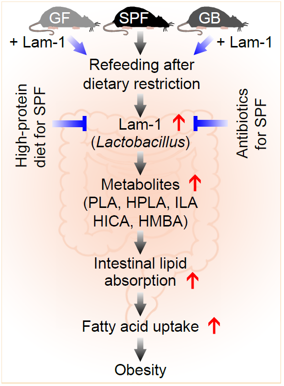图:节食终止后出现肥胖的机理及相应的干预策略。节食会导致肠道中一种乳酸杆菌(Lam-1)丰度大幅增加,并进一步影响相应代谢物的水平,从而增强了肠道脂质吸收,并进一步导致白色脂肪的脂肪酸摄入增强,最终导致肥胖。高蛋白饮食和特定抗生素干预可以有效抑制该过程。