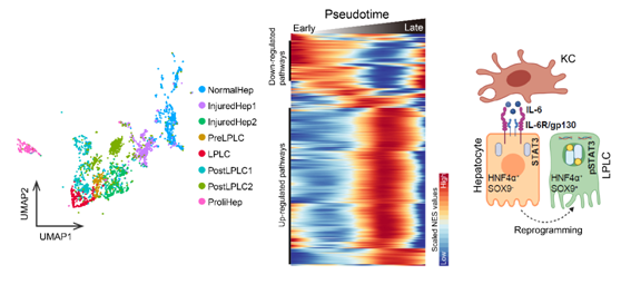 在该工作中,研究人员通过对单细胞转录组测序数据的深入分析,鉴定了健康肝脏和损伤肝脏中不同的肝细胞亚群,并从中鉴定出一组高表达Sox4,Sox9,Spp1,Cd24a等干性相关基因的肝细胞亚群。该细胞类群与之前报道的Sox9阳性类肝前体细胞 (Liver progenitor-like cells, LPLCs)高度相似,因此认为是LPLCs。通过伪时序分析,研究人员首次重塑了正常肝细胞经损伤后重编程(reprogramming)转变为LPLCs的过程。通过对生物学通路富集打分与细胞伪时间(pseudotime)进行建模,得到重编程过程中显著变化的信号通路,发现损伤下免疫信号通路与重编程高度相关。另外,通过比较Non-LPLCs肝细胞,鉴定出了reprogramming related genes。这些为后续机制实验的开展提供了线索和方向。之后,研究人员对肝脏的不同免疫细胞进行了复杂的敲除实验,发现肝脏驻留Kupffer细胞(KCs)是LPLCs出现所必要的,而阻断单核来源的巨噬细胞(MoMFs)及其他免疫细胞对LPLCs出现无影响。通过解析肝损伤下巨噬细胞的单细胞测序数据及大块组织样本测序数据,结合体内筛选实验,研究人员发现IL-6可以在无损伤的肝脏内直接结合肝细胞IL6R/gp130诱导LPLCs的出现,其下游是通过STAT3信号转导实现。之后,利用ChIP-seq技术,研究人员证明STAT3能够结合重编程基因预先开放的染色质区域。有趣的是,研究人员发现胚胎发育过程中STAT3并未激活,组蛋白H3K27ac修饰在LPLCs相关的增强子区域也未激活,说明了肝脏损伤下IL-6/STAT3信号是结合了损伤特异的增强子诱导了前体基因的表达。本研究揭示了肝脏损伤下巨噬细胞的炎症信号通过损伤特异的转录调控模式诱导肝细胞去分化的机制,该机制为探索诱导体内重编程的因子,开发治疗肝脏疾病相关药物,奠定了重要的理论基础。