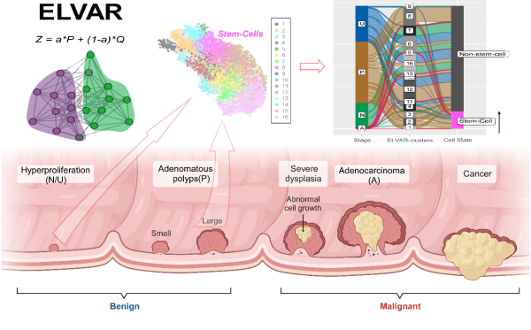 图例:ELVAR算法可利用不同阶段结直肠腺癌的单细胞核RNA-Seq数据检测关键细胞类型的丰度。如图所示,肠干细胞丰度在息肉中相对于正常组织有所增加。