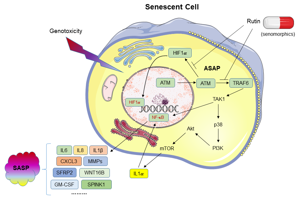 7月20日,国际学术期刊Aging Cell杂志在线发表了中国科学院上海营养与健康研究所孙宇研究组题为“Rutin is a potent senomorphic agent to target senescent cells and can improve chemotherapeutic efficacy”的研究成果,揭示了植物化学小分子Rutin,通过作用于衰老相关分泌表型SASP发生发展过程中的早期信号通路,特异性靶向干扰ATM与HIF1α、ATM与TRAF6之间的协同互作,从而使得衰老细胞失去SASP这一经典特征。