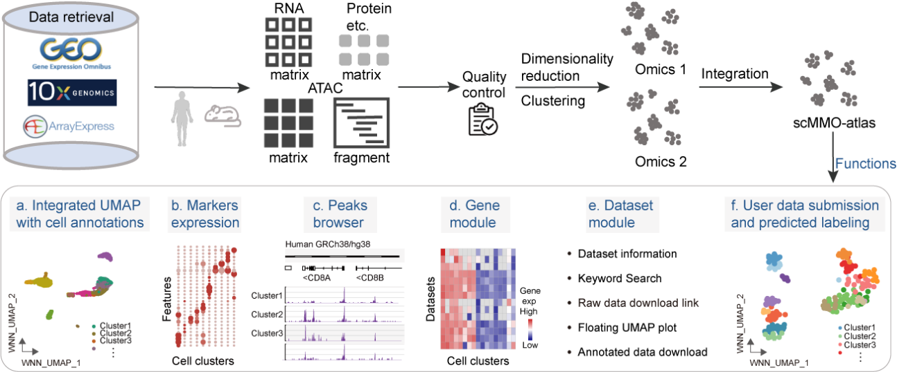 该研究收集和整合了70多个高质量的单细胞多模态组学数据集,构建了scMMO-atlas数据库?(https://www.biosino.org/scMMO-atlas/),包括来自852个样本的3,168,824个细胞的单细胞多模态组学数据。scMMO-atlas提供了一个交互式的门户网站,提供多种模态和整合数据的可视化和特征分析,包括细胞类型注释,细胞亚群的表达标签,细胞亚群特异性染色质可及性,基因??楹褪菁??,并提供用户上传数据和分析结果下载。