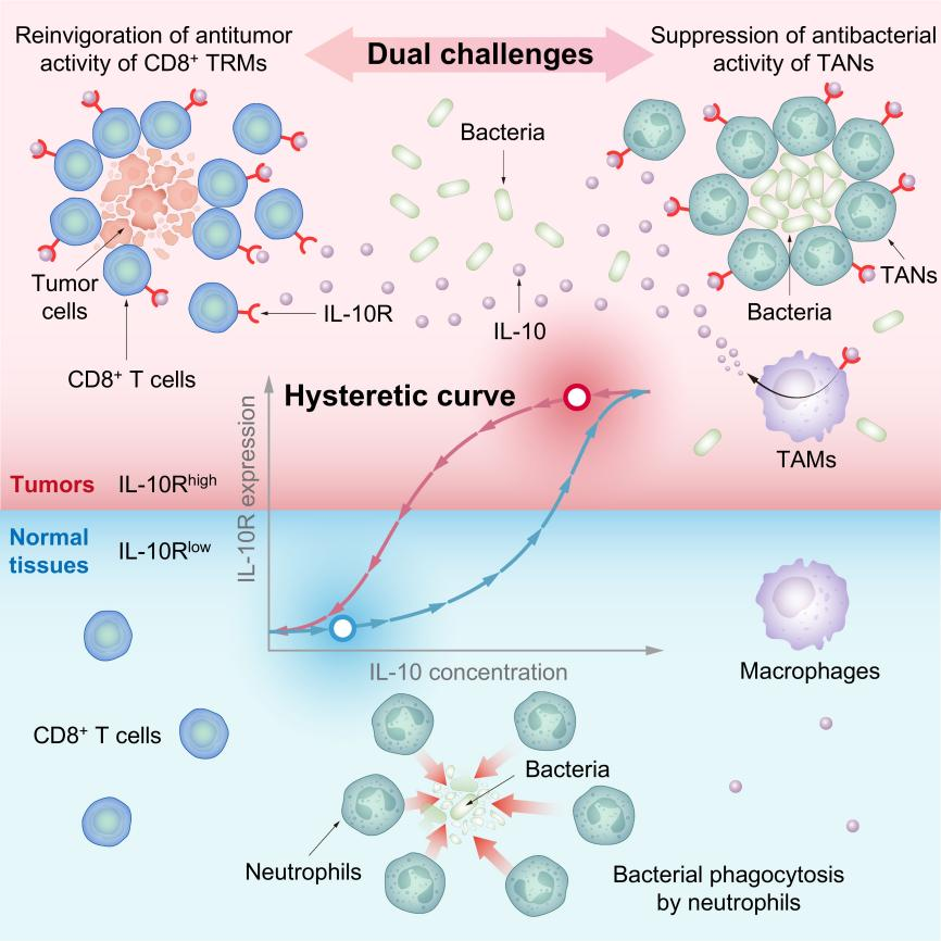 图:IL-10R迟滞效应导致了肿瘤微环境内的免疫细胞IL-10R高表达特性,细菌利用这一特性,同时实现了其避免被中性粒细胞快速清除,并激活肿瘤内组织驻留记忆CD8+?T细胞高效杀伤癌细胞。