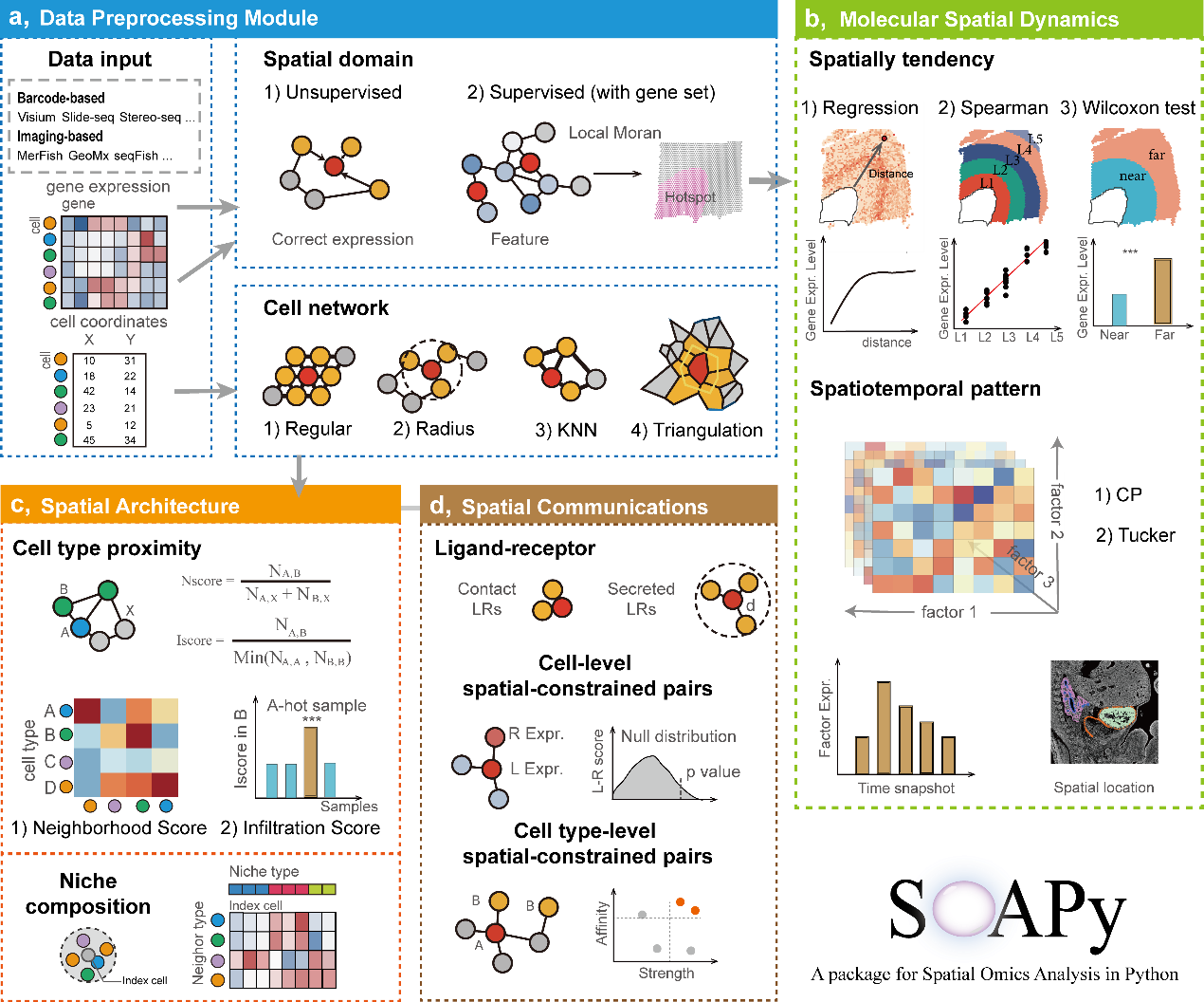 图:面向空间组学的微环境解析工具包SOAPy,包括预处理、空间分子动力学、空间结构和空间通讯四个???。