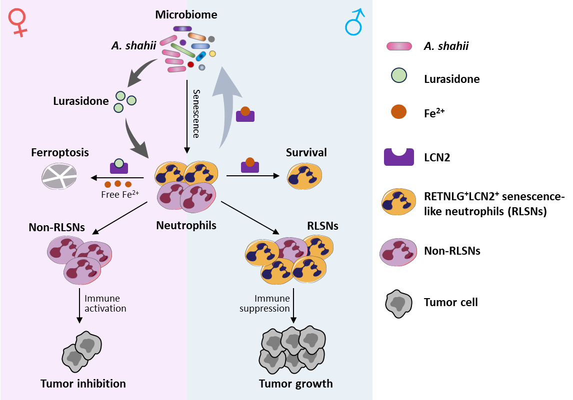 基于先前研究提示中性粒细胞衰老由肠道微生物群调节,研究团队进一步发现雌性小鼠肠道中一种名为Alistipes shahii的肠道菌(以下简称A.?shahii)显著增多,且该菌相关的代谢产物鲁拉西酮的水平在雌性小鼠中更高。鲁拉西酮可直接靶向RLSNs中的标志性蛋白——LCN2,由于LCN2是一种铁螯合蛋白,由此释放细胞内Fe2?并促进RLSNs的铁死亡,最终清除了雌性肿瘤中富集的RLSNs。而雄性因缺乏A.?shahii及鲁拉西酮,导致RLSNs的铁死亡被抑制,并大量积累在雄性肿瘤微环境中以抑制抗肿瘤免疫。此外,雄性体内积累的RLSNs会分泌大量LCN2蛋白以清除对铁敏感的A. shahii,进一步抑制了体内A. shahii的含量。