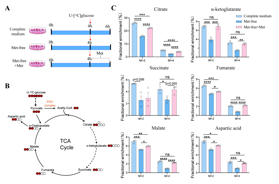 图:通过碳同位素示踪技术(13C-Glucose代谢流分析)发现,剥夺甲硫氨酸可显著降低TCA循环代谢物(如柠檬酸、α-酮戊二酸)水平