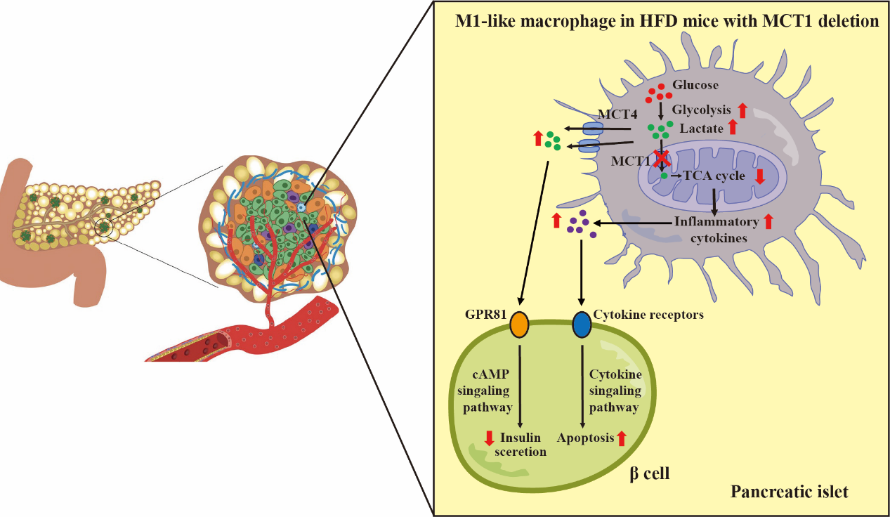 陈雁研究组利用免疫荧光和乳酸荧光探针等技术,揭示巨噬细胞乳酸转运蛋白的亚细胞定位与功能差异,发现线粒体膜定位的单羧酸转运蛋白1(MCT1)介导胞内乳酸向线粒体穿梭,促进巨噬细胞向抗炎M2型极化,而细胞膜定位的MCT4则主要促进乳酸外排,增强促炎M1型极化。?为明确其生理和病理意义,研究人员构建了巨噬细胞特异性MCT1敲除小鼠模型。与对照组相比,在高脂饮食诱导的肥胖和2型糖尿病小鼠模型中,MCT1敲除小鼠表现出糖稳态紊乱和胰岛功能损伤。进一步研究发现,MCT1缺失加剧了巨噬细胞的炎症反应,促进了胰岛β细胞的凋亡。