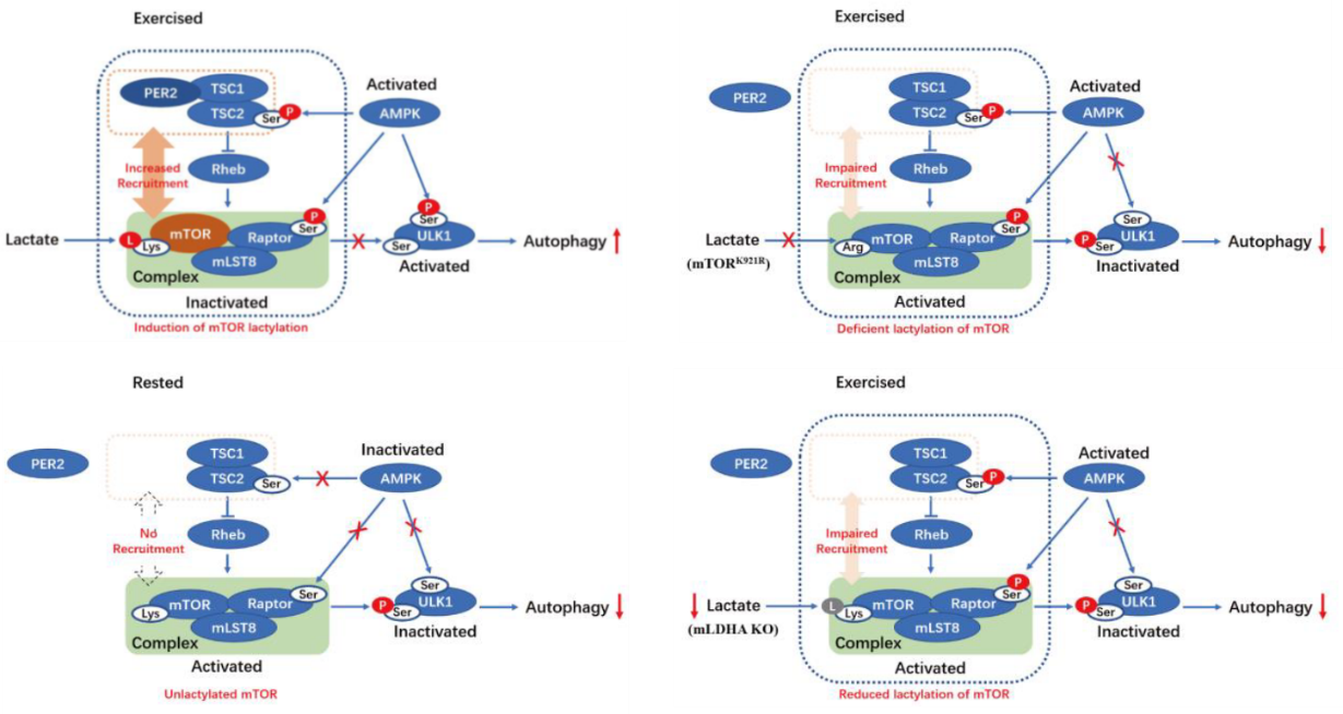 通过该项研究,研究团队提出以下工作假说(见下图):运动导致骨骼肌乳酸迅速升高;升高的乳酸直接乳酸化修饰mTOR蛋白的K921位点;此修饰协同AMPK的激活,共同抑制mTORC1活性;mTORC1的抑制进而解除其对自噬启动的刹车作用,最终激活自噬,清理受损细胞器,维持肌肉健康。
