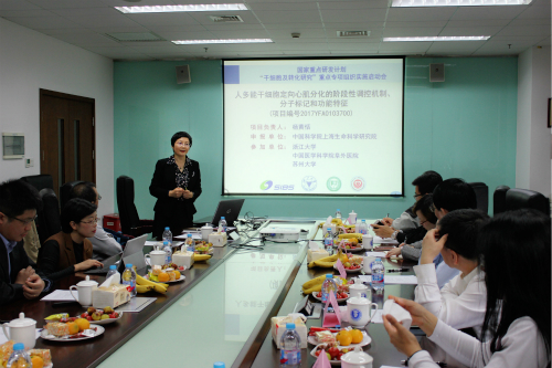 杨黄恬首先对专家组的指导、上??莆约氨镜ノ坏闹С直硎靖行唬⒍韵钅康牧⑾钜谰?、工作基础、工作目标、预期成果、研究团队与组织机制、主要研究进展等方面进行了系统阐释和工作部署。随后,各课题负责人报告了项目的研究内容、考核指标、课题方案和主要工作进展。与会专家对项目研究的整体设计和各课题组的前期工作给予了充分肯定,并就项目实施的具体方案提出了诸多宝贵建议,为进一步明确工作目标、完善项目的研究内容、技术路线、发挥各项目团队的合作优势以及促进干细胞治疗的临床转化研究提供了重要参考。