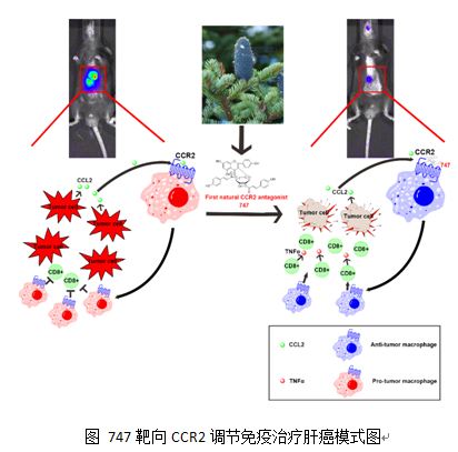 在王慧研究员指导下,博士生姚文博等筛选到一个天然CCR2拮抗剂747,通过体内外实验确证了其具有良好的选择性、敏感性和安全性,可以通过阻止肿瘤巨噬细胞浸润并使巨噬细胞分化为抑制肿瘤的表型,增加CD8+T细胞的数量并增强CD8+T细胞的杀伤能力来抑制肝癌发展,并且作为免疫调节剂联合低剂量的肝癌靶向治疗药物索拉菲尼,可增强索拉菲尼的治疗效果。综上,该研究发现了一种名为747的新型天然CCR2拮抗剂,为CCR2拮抗剂的开发提供了新的视角,并表明免疫调节剂与化疗药物联合使用可能是肝癌治疗的一种新策略。