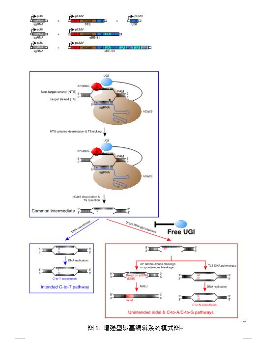 近年內兴起的CRISPR/Cas9基因编辑技术利用可设计的Cas9核酸酶通过碱基插入、缺失或替换等方式,对生物体基因组DNA特定片段进行改造,进而实现对靶基因的编辑。传统的CRISPR/Cas9基因编辑技术虽然具有较高的基因敲除效率,但其在执行碱基替换(对譬如基因突变进行矫正)的效率通常很低,这也限制了CRISPR/Cas9基因编辑工具从科研向应用的全面转化。近期发展出的碱基编辑(base editing)系统,由CRISPR/Cas9和APOBEC胞嘧啶脱氨酶两个独立的体系整合而成,可在基因组靶向位点实现由胞嘧啶(cytosine, C)向胸腺嘧啶(thymine, T)的编辑改造(Komor et al., 2016, Nature)。其中,BE3虽然实现了较高的C至T编辑效率,但是也伴随着较高水平的非目的性碱基插入或缺失(insertion/deletion, indel)和C至A或G的编辑副产物,这些都显著地降低了碱基编辑器在基础研究和临床上的深入应用。在这项最新的研究中,科研人员在前期对BE3导致非目的性突变机制探索的基础上,利用共表达UGI的方法,成功开发出了增强型基因组碱基编辑器-eBE。利用多种UGI与BE3共表达的策略,eBE实现了更高精度和更高效率的碱基编辑,为碱基编辑技术在基础研究及未来临床领域的深入应用提供了新方法和新思路。