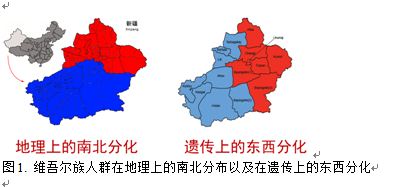 研究发现,维吾尔族人群的遗传成分主要起源于欧亚大陆上东、南、西、北四个方位的已分化的人群,大致可以由现代东亚人(约28.8% – 46.5%),南亚人(约12.0% - 19.9%),西欧人(约24.9% – 36.6%)和西伯利亚人(约15.2% – 16.8%)来代表(图 2 )。有趣的是,这四种遗传成分比例在东北部和西南部维族亚群体中呈现显著的差别。来自东部(东亚和西伯利亚)的遗传成分在东北维族人群中要显著高于西南维族人群,并随着经度的增加而增加(越往西成分越少),而来自西部(西欧和南亚)的遗传成分则正好呈现相反的趋势。这个结果揭示了来自相邻人群的基因流可能是维族在遗传结构上呈现“东-西”分化的重要因素。