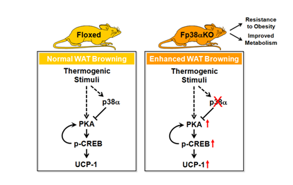 p38是MAPK家族成员中重要的应激激活蛋白,属于丝氨酸/苏氨酸激酶。p38的磷酸化激活主要通过MAP3K/MKK/MAPK的三级激酶链连锁反应,其激活位点的去磷酸化主要通过磷酸酶来进行。p38包括 , , 和 四种亚型,各自的分布具有组织特异性。其中,p38 在全身各组织广泛表达,是肝脏、脂肪等组织表达的主要亚型。应浩课题组的前期研究发现,在肝脏中p38 能够调控糖异生过程(Jing Y, Liu W and et al. Journal of Hepatology 2014)。但是在脂肪中,p38 对能量代谢的作用并未得到系统的研究。