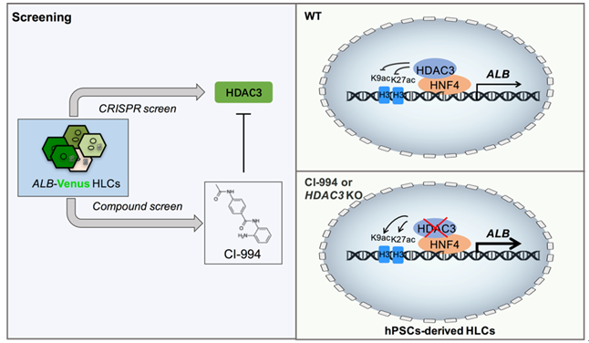 为进一步优化体外定向分化体系,促进肝脏细胞的成熟和均一化,博士研究生李爽等人在肝脏成熟标志物白蛋白(ALB)终止密码子前定点敲入绿色荧光蛋白(Venus)表达框,建立了成熟肝脏谱系标记的人多能干细胞报告株。并在此基础上,运用CRISPR全基因组敲除慢病毒文库,进行了大规模遗传筛选,鉴定出ATG7,RPS6KA2, HDAC3等若干基因参与调节人多能干细胞体外肝向分化。同时根据筛选出的调节基因及其相关功能提示,进一步进行了有针对性的化合物文库筛选,发现一个组蛋白去乙?;感》肿右种萍?/span>CI-994能显著促进HLCs的定向分化;并发现该小分子同样能抑制原代肝脏细胞体外培养过程中肝脏属性的快速丢失。全基因组敲除慢病毒文库筛选和小分子化合物库筛选都证实了组蛋白去乙?;?/span>HDAC3是肝脏分化的重要调控因子,进一步的研究发现HDAC3可以与肝脏谱系关键转录因子HNF4等结合共同调节肝脏细胞分化过程。