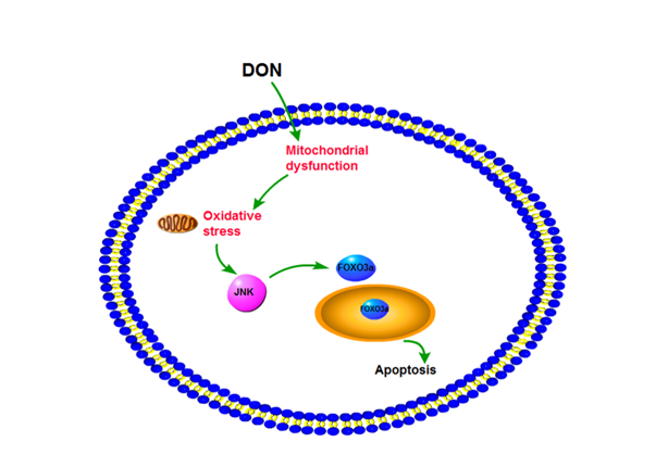 博士研究生杨云霞等基于DON毒素的致呕特性,选择胃肠系统中的人源性细胞GES-1与DON毒素暴露互作。研究结果表明,DON暴露可诱导GES-1细胞发生氧化应激,线粒体功能失调,激活ROS-JNK-FOXO3a信号通路;活化的FOXO3a发挥转录调节作用,影响细胞的抗氧化、周期阻滞及凋亡。还通过模式生物线虫对FOXO3a(同系物DAF16)进行了体内生物学功能验证。