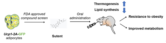 图注:我们通过Ucp1-GFP脂肪细胞株筛选一个小分子化合物库,发现一个可以显著促进UCP1表达的药物——索坦(Sutent),利用小鼠模式动物,通过体外和体内验证,索坦可以促进机体非颤抖性产热和抑制脂质合成从而抵抗由高脂饮食诱导的肥胖,并改善机体代谢。
