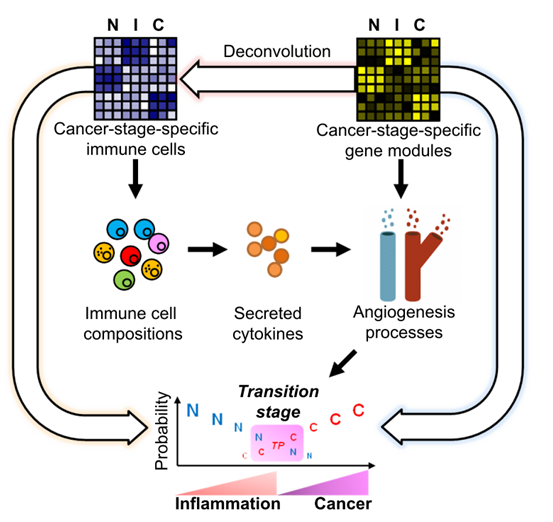 尽管人们已知慢性炎症增加多种癌症的风险,然而炎症如何促进癌症发展仍然没有被明确研究。其中,判断炎症组织何时向癌症转变至关重要。为实现无偏检测免疫细胞及其分泌因子影响炎症-癌症转变的分子机制,本课题研究人员开发了计算方法“SwitchDetector”。分别基于肝癌、胃癌和结肠癌的转录组数据,识别出血管生成作为多种癌症的炎症-癌症转变的共同关键事件;并利用浸润免疫细胞类型的组成情况、以及其分泌或抑制的胞外因子来预测该关键事件的基因表达。这些识别出的胞外因子可作为潜在的癌症前、癌症早期检测的生物标记物,并且可以与血管生成基因一起实现癌症预后和病人免疫治疗响应的准确预测。SwitchDetector软件以及炎症-癌症(inflammation-to-cancer,I2C)数据库在www.inflammation2cancer.org公开发布,可供下载和查询。(科技处)