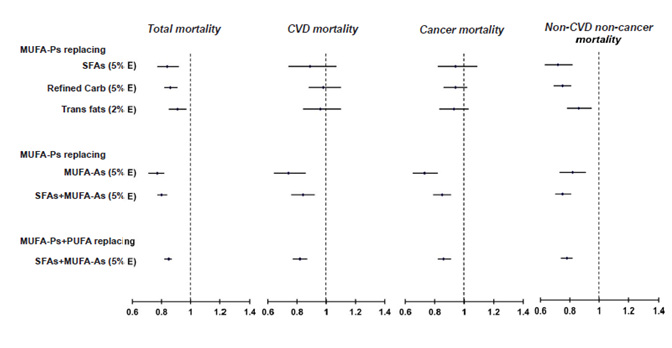 本研究纳入了2个大规模的前瞻性研究队列【护士健康研究(Nurses’ Health Study)、健康医护人员研究(Health Professionals Follow-up Study)】的近10万名调查对象,研究人员根据每四年一次的饮食问卷(FFQ)和产期更新的食品成分数据库评估调查对象的长期膳食状况。在22年的随访期内,共发现死亡案例20,672例。通过统计分析,研究人员发现总MUFAs和MUFA-Ps与总死亡率呈负相关,而MUFA-As与总死亡率呈正相关。尤其值得引起注意的是,当植物来源的MUFA替换相同热量(按每日总能量摄入的5%计算)的饱和脂肪酸时,总死亡率下降16%;替换精加工的碳水化合物时,总死亡率下降14%;替换动物来源的MUFA时,总死亡率下降23%,心血管疾病死亡率下降26%,癌症死亡率下降27%,其它死亡率下降18%(下图)。(科技处)