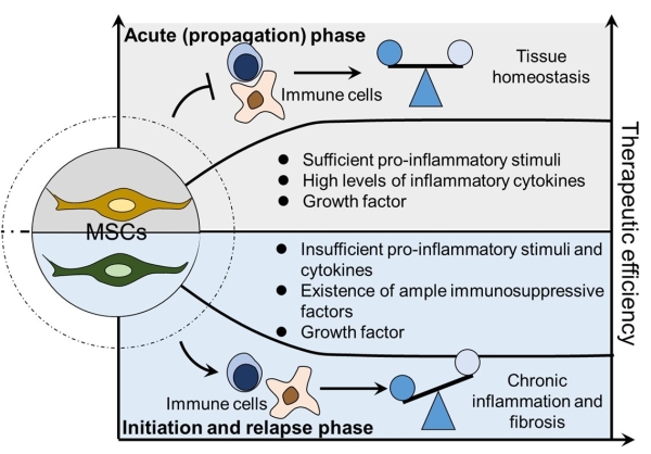 图注:间充质干细胞(mesenchymal stem cells, MSCs)免疫调节可塑性及其在炎症性疾病治疗中的应用潜能。