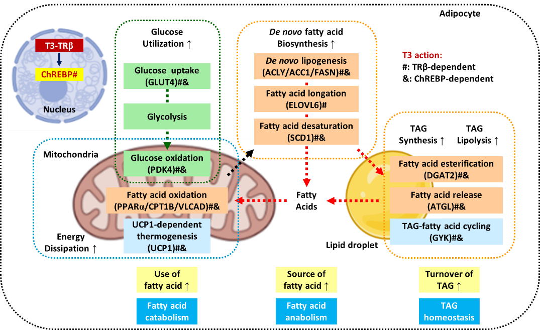 机制研究发现,在iWAT中T3以TR 依赖的方式调控一个重要的转录因子ChREBP的表达。体外实验提示,ChREBP介导了T3对糖脂代谢及能量代谢关键基因的表达。以往的研究提示,白色脂肪细胞ChREBP可通过促进胞内脂肪酸从头合成,改善全身代谢,于是该研究还分析了脂肪细胞TR 的缺失的后果。发现ATR KO小鼠iWAT的脂肪酸从头合成相关基因表达下调,更易发生饮食诱导的肥胖和代谢失调。该研究不但表明脂肪组织内的TH作用对于全身代谢稳态也具有调控作用,而且还揭示了脂肪TH-TR 信号通路通过ChREBP调控脂肪细胞代谢和全身代谢的新机制,为靶向脂肪组织的TR 激动剂的研发和临床应用提供了理论基础。