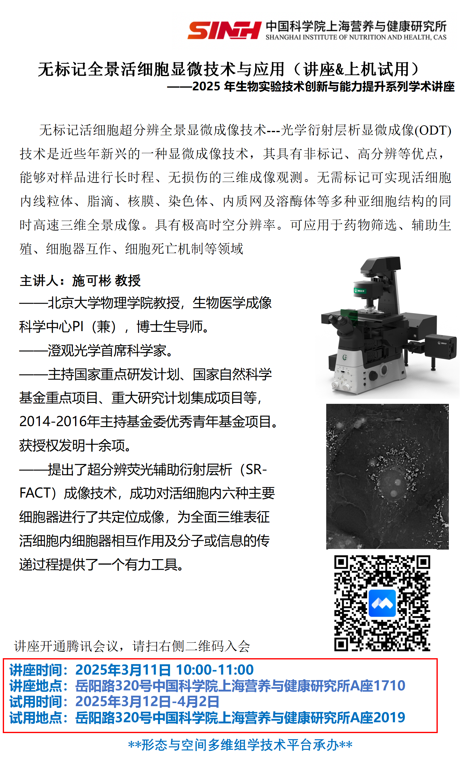 3月11日|无标记全景活细胞显微技术与应用(讲座&上机试用)-2025年生物实验技术创新与能力提升系列学术讲座