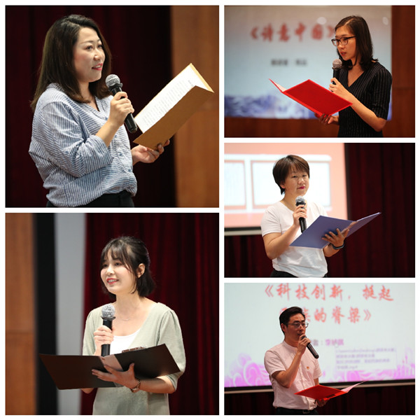 在初赛环节,主办方共收到来自岳阳路园区内近30份各具特色的朗读作品,经初评共有10位(9组)选手入围现场决赛环节。其中,一号选手王慧媛用她温婉的语调带来描写亲情的朗读作品《背影》;二号选手常安妮的一首《我有一个可爱的祖国》,让观众仿佛置身于祖国秀美的画卷中;三号选手姚远则娓娓道来,《诗意中国》温润祥和;四号选手陆娇用饱满的情感生动地诠释了朗读作品《赵云霄写给女儿启明》;五号选手李祯祺用沙画为背景精彩的演绎了朗诵作品《科技创新,挺起民族的脊梁》;六号选手朱培英则带来了她自创作品《哦,我的故乡》,让现场观众印象深刻;七号选手王思敏、曾春玲组合与九号选手管兴华均选择了《我的祖国》作为朗诵内容,但他们用不同的形式展现各自心中对祖国母亲的热爱之情;八号选手刘志睿则用英文朗诵的方式展示了他的朗诵作品《壮哉!中国共产党》。最终,经过激烈角逐,由朱培英同志带来的原创作品获得朗读者比赛的桂冠。