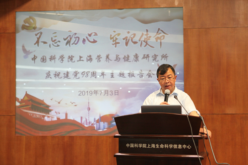 2019年7月3日上午,中科院上海营养与健康研究所组织召开庆祝建党98周年暨“不忘初心,牢记使命”主题报告会,特邀中国科学院院士、上海市科技功臣奖获得者、原上海有机化学研究所所长林国强研究员为全体党员作《坚定创新自信,科技发展引领未来》的主题报告,营养与健康所领导班子及助理、两委委员、科研骨干、行政管理部门负责人等150余人参会了学习。党委书记蔡澎主持报告会。