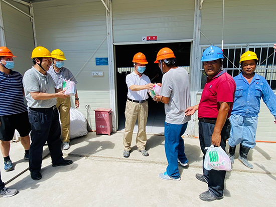 所领导班子成员为高温下坚持抓质量、赶进度的各个岗位上的同志们送上“清凉”,并且殷切嘱咐全体工作人员一定要做好高温防护措施,只有劳逸结合才能事半功倍地建设好项目。