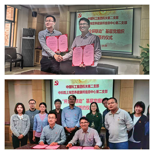 10月20日上午,中煤科工集团上海研究院机关第二党支部到访上海营养与健康研究所信息中心第二党支部开展结对共建签约活动。中煤科工集团上海研究院机关二支部书记、办公室副主任刘海鹏,财务部部长杨志军,企业发展部部长申小林,营养与健康所信息中心党总支书记熊燕,第二党支部书记陈大明以及双方支部党员骨干代表参加活动。