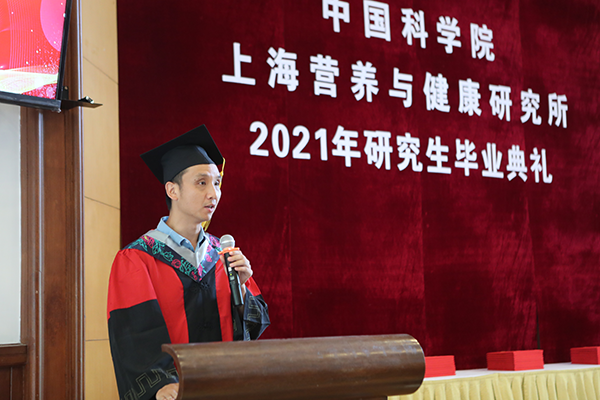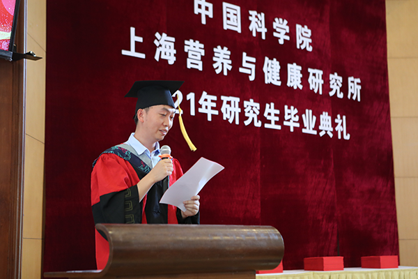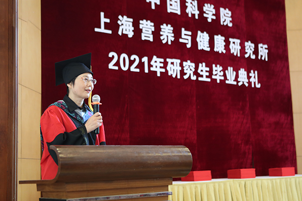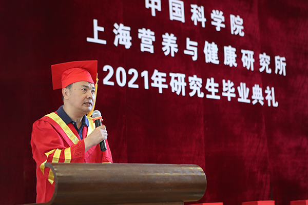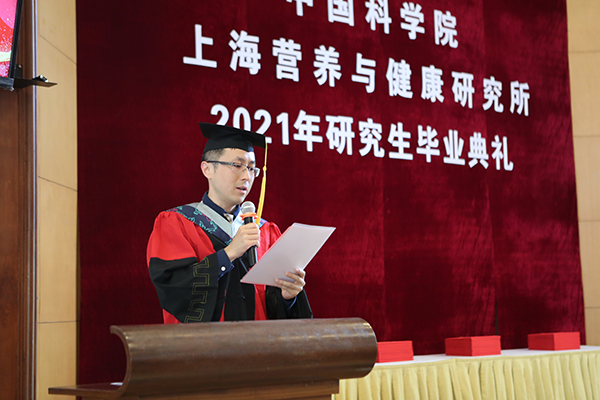 6月25日,中国科学院上海营养与健康研究所2021年研究生毕业典礼在生科大楼报告厅隆重举行。营养与健康所所长、学位评定委员会主席李林院士,副所长兼学位评定委员会副主席胡国宏,学位评定委员会委员孔祥银、李昕、邵振、王泽峰、肖意传、杨力,导师代表杨黄恬、时玉舫、孙宇、胡黔楠、熊燕,2020届、2021届毕业生以及研究生部参加了本次典礼。毕业典礼由胡国宏主持。