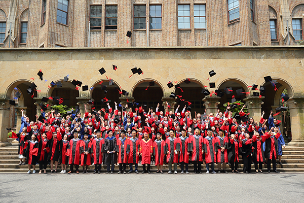 出席毕业典礼的学位评定委员会委员为毕业生们拨正学位帽流苏,颁发毕业证书并合影留念。