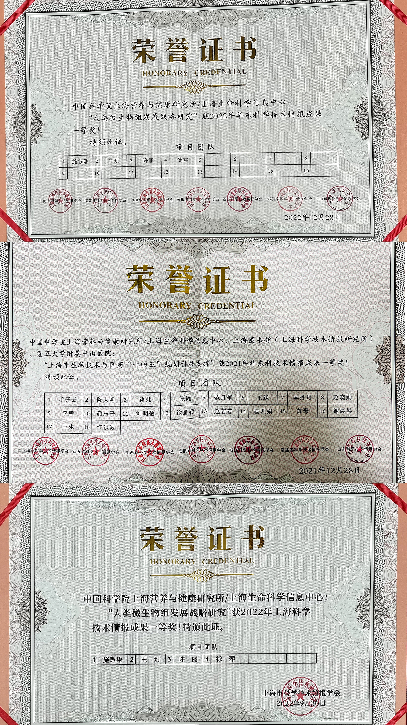 中国科学院上海营养与健康研究所/中国科学院上海生命科学信息中心(生命健康科技智库)作为中科院部署的五大情报研究与服务体系之一,面向研究所、中国科学院、国家相关部委以及企业与园区等,提供科技战略决策支撑、开展学科发展战略研究,支撑区域科技创新发展等。在过去的两年中,情报团队凭借长期以来在科技战略、产业与技术情报中的杰出表现,先后荣获2022年华东地区科学技术情报成果奖一等奖1项,二等奖2项;2022年上海地区科学技术情报成果奖一等奖1项,二等奖5项,三等奖1项;2021年华东地区科学技术情报成果奖一等奖1项,三等奖2项;2021年上海地区科学技术情报成果奖二等奖4项,三等奖2项。