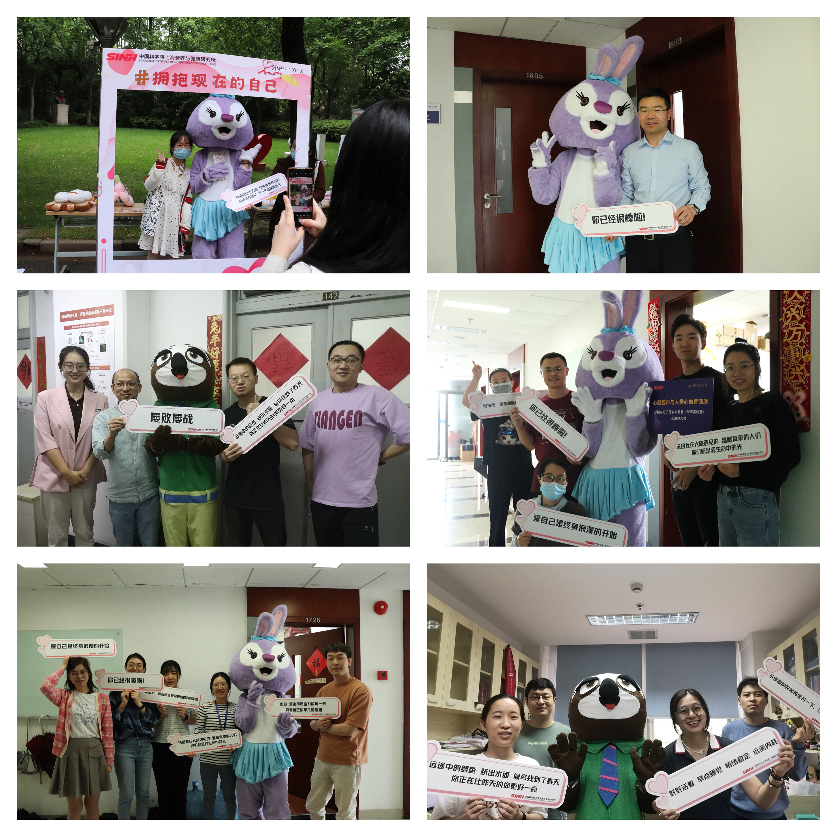 活动当天,工作人员身穿可爱的玩偶服,前往各楼层实验室,与师生亲密互动并向大家普及心理健康知识。
