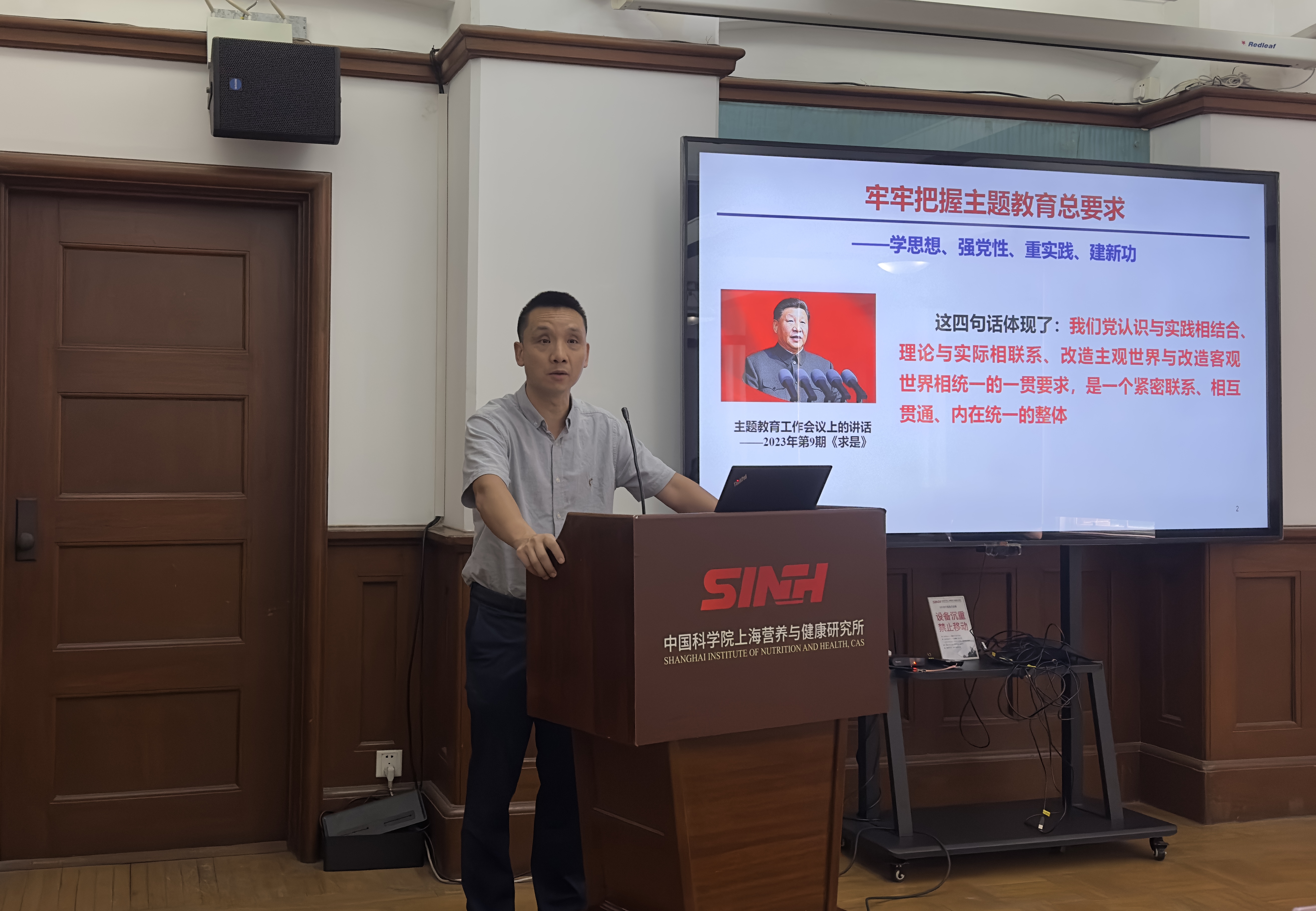 7月26日,中国科学院上海营养与健康研究所召开学习贯彻习近平新时代中国特色社会主义思想主题教育专题党课报告会,中国科学院上海分院副院长、分党组成员高召兵到会指导。所领导班子成员、两委委员、全体管理与支撑部门工作人员70余人参加了会议。会议由党委书记瞿荣辉主持。