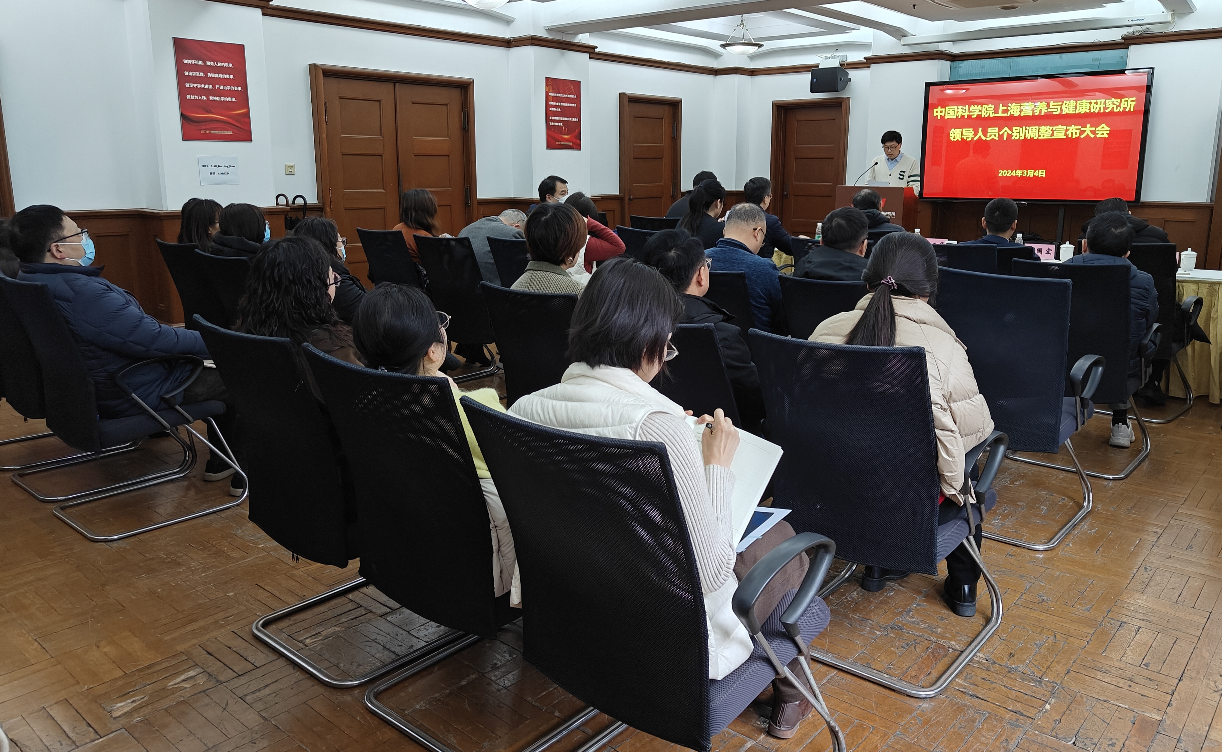 3月4日下午,中国科学院上海营养与健康研究所召开领导人员个别调整宣布会议。中国科学院上海分院分党组书记、沪区党委书记李正华,上海市科技党委组织人事处徐畅,上海分院人事人才处处长胡嘉出席会议。研究所领导班子成员、“两委”委员、科研骨干代表、中层领导人员等40余人参加会议?;嵋橛珊沃鞒?。