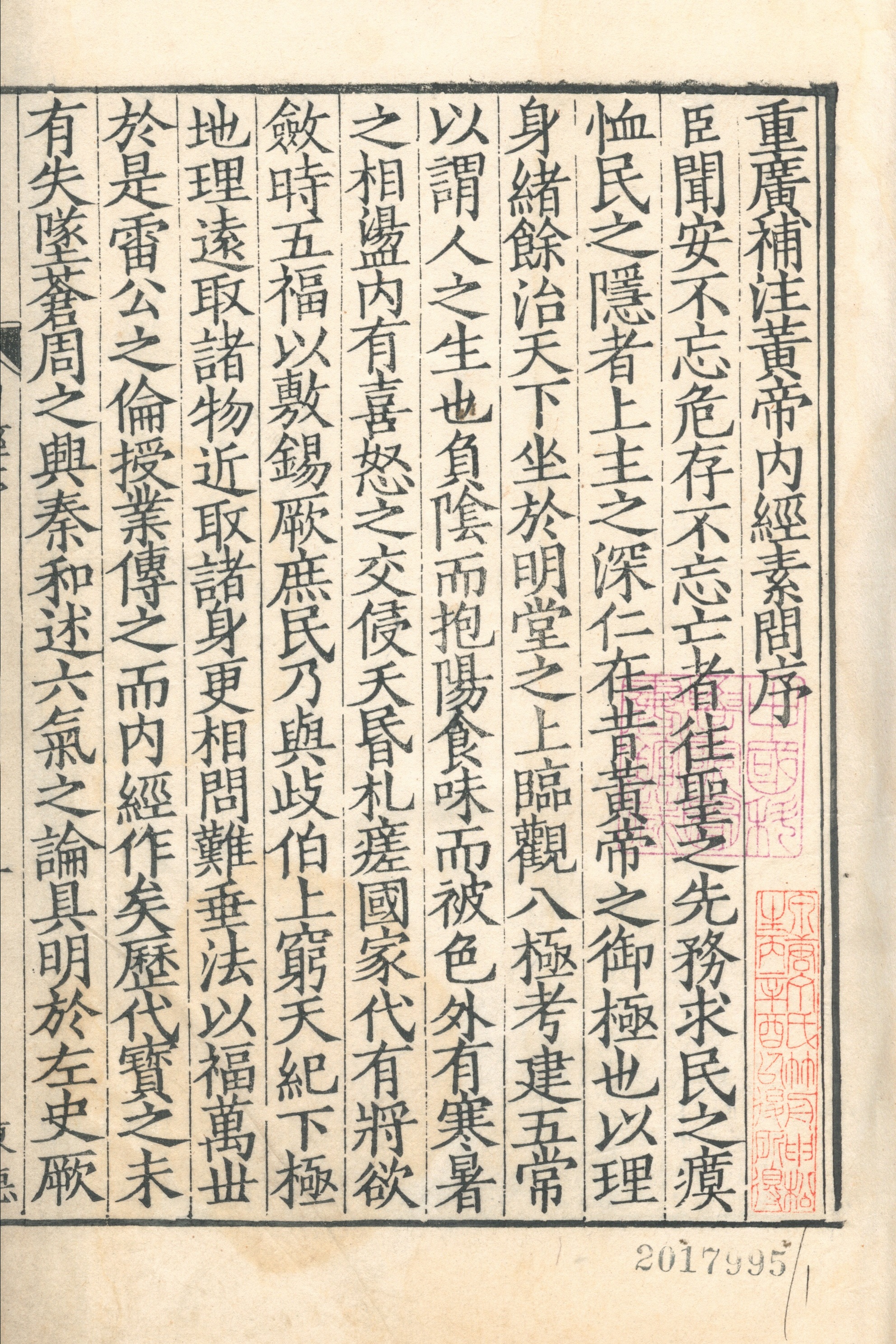 3.重广补注黄帝内经素问二十四卷,唐王冰注,宋林亿等校正,宋孙兆改误,明嘉靖二十九年(1550)顾从德影宋刻本;