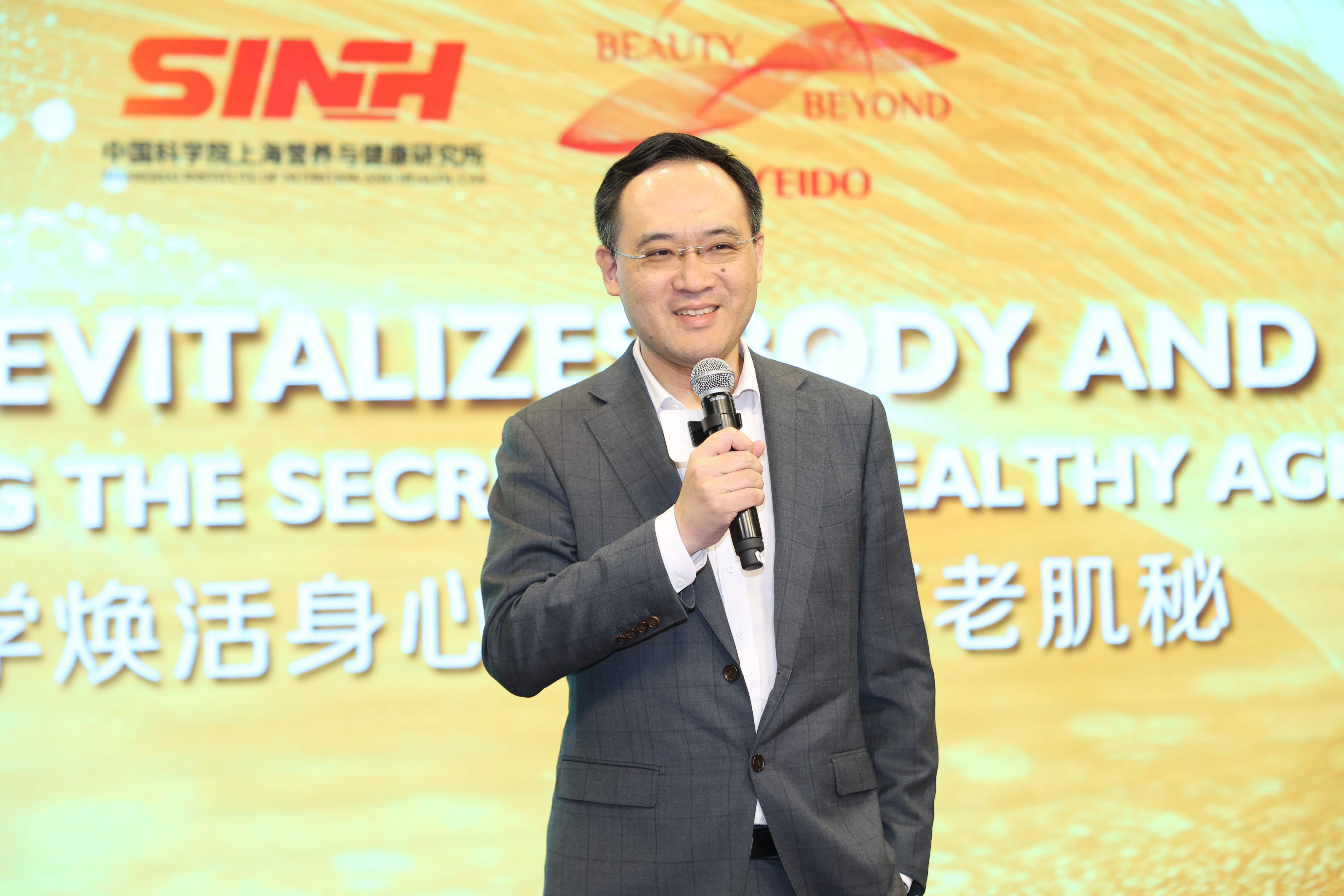 在主题演讲环节,资生堂全球创新中心副总裁加治屋健太朗以“资生堂对于肌肤‘整体美’的研究”为题,重点介绍了资生堂在免疫、血管、淋巴管、神经系统等对皮肤影响的深入研究和科研成果,展示了资生堂在肌肤免疫学领域专研30余年的历程。随后,营养与健康所研究员代表分别介绍了各自研究领域的进展及成果:汪思佳研究员介绍了皮肤基因组学与表型组研究;王莹研究员分享了干细胞与组织微环境互作在皮肤稳态维持与再生修复中的机制与应用策略;张亮研究员分享了皮肤及其毛发老化的机制及干预研究;肖意传研究员分享了靶向免疫衰老干预炎症和肿瘤相关研究;周犇研究员分享了线粒体与衰老的相关研究进展;陆炯明研究员分享了营养干预与健康衰老机理方面的研究。