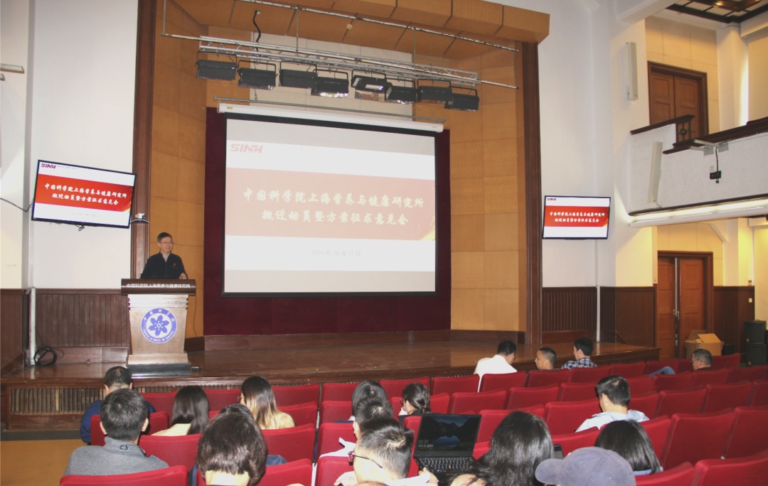 10月31日下午,中国科学院上海营养与健康研究所在生科大楼报告厅召开园区搬迁动员暨方案征求意见会。党委书记瞿荣辉,所长、党委副书记汪思佳,所领导班子成员,党委委员,纪委委员,所务委员及各单元负责人等70余人与会。