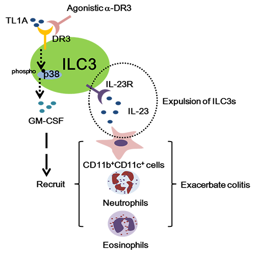 该项研究利用DR3激动性抗体( -DR3)在体内激活TL1A/DR3信号,从而研究TL1A/DR3信号对ILC3的调控作用。研究发现激活DR3信号会造成大肠ILC3细胞数目的减少。利用中和性抗体中和体内的GM-CSF和IL-23都能够显著地逆转 -DR3引起的大肠ILC3减少?;蒲芯糠⑾?, -DR3通过活化ILC3的p38信号通路从而促进其GM-CSF的分泌。GM-CSF分泌的增加能够进一步导致招募致炎性髓系细胞(嗜酸性粒细胞、巨噬细胞以及中性粒细胞)到肠道,髓系来源细胞的浸润最终造成IL-23表达的增加和肠道炎症的加重,IL-23则最终造成大肠ILC3细胞的减少。该研究利用可溶性DR3蛋白中和体内的TL1A能够有效地缓解 -CD40以及DSS诱导的肠炎。另外, -DR3的体内处理能够加重DSS诱导的肠炎,并且 -DR3对肠炎的加重作用并不依赖于适应性免疫系统。更为重要的是,在ILC3缺失的情况下, -DR3不能够加重DSS诱导的肠炎,这表明 -DR3加重肠炎的作用依赖于ILC3。