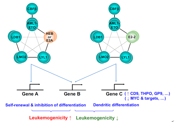 研究发现,过表达E2-2可以特异性地抑制携带AML1-ETO融合基因的Kasumi-1细胞生长,并且该作用是依赖于E2-2的bHLH(basic helix-loop-helix)结构域的。对Kasumi-1细胞进行了RNA-seq和ChIP-seq的分析,发现E2-2能将AETFC转移到一些新的靶基因上,激活与细胞分化相关的基因例如THPO,诱导白血病细胞向树突状细胞分化。在白血病患者标本中,E2-2的表达在M2b亚型中相对较低,并且E2-2的靶基因THPO的表达水平与患者的复发率存在相关性;在小鼠模型中,抑制E2-2的表达能够加快AML1-ETO介导的白血病发生。这些结果表明E2-2可能形成一个新的AETFC亚型,通过调控AETFC异质性从而扮演了t(8:21)白血病的负调控因子的角色。