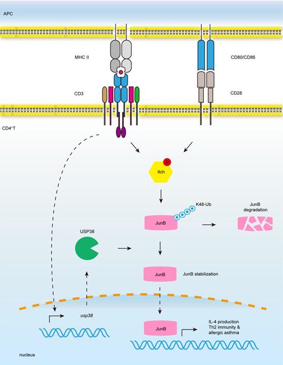 该研究首次鉴定出参与Th2细胞分化的去泛素化酶。现有研究发现TCR信号能够通过JNK激活泛素化酶Itch的活性,从而促进JunB的降解,我们的研究发现Itch并不能被TCR诱导,因此,USP38的诱导能够反作用于JNK-Itch信号,成为调节TCR下游信号事件的检验点,为理解2型免疫及其相关疾病提供了更为丰富的理论基础和潜在的特异性治疗靶点。